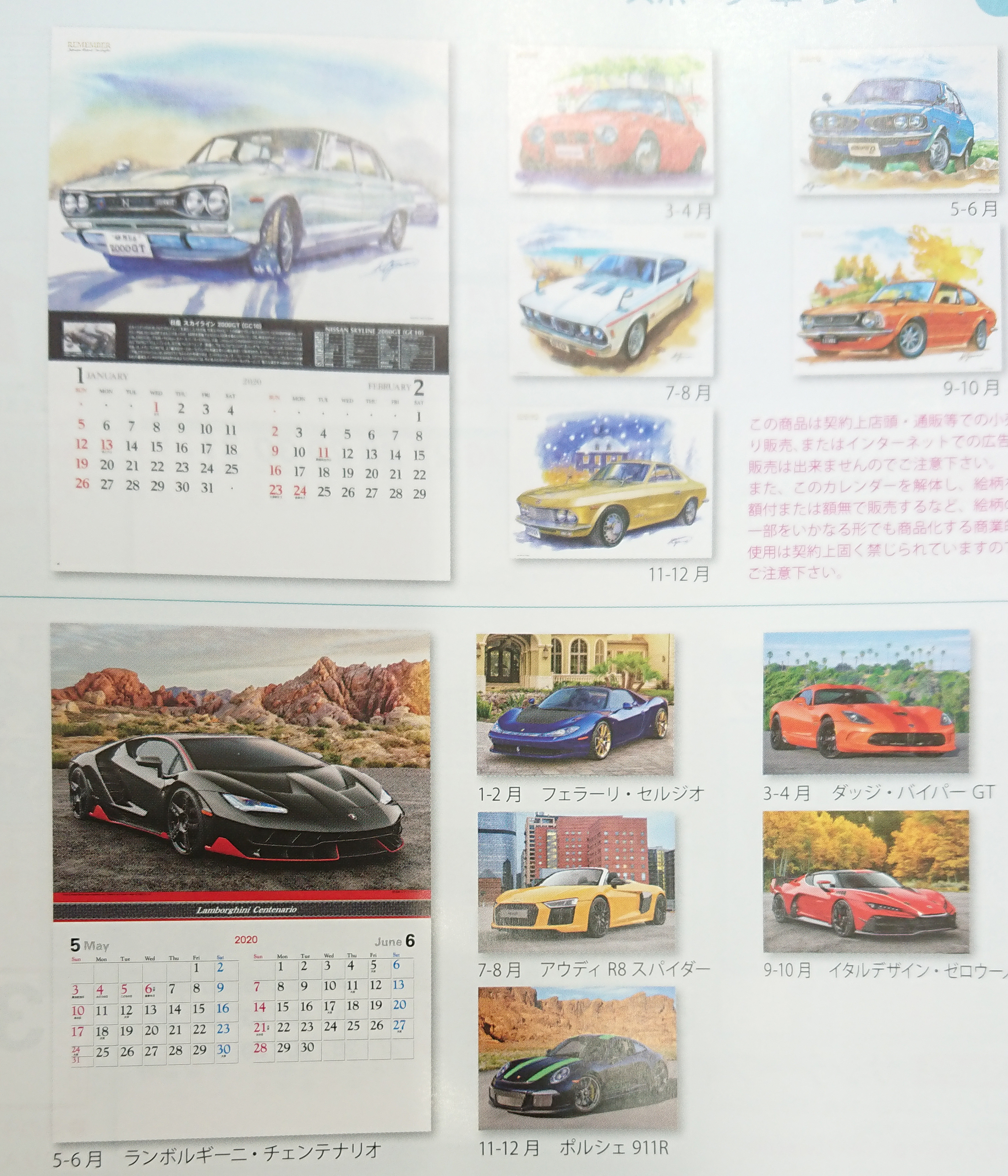 ビンテージな日本車のイラストのカレンダーなんてのも落ち着きますね。憧れの高級スポーツカーも目の保養にはなります。