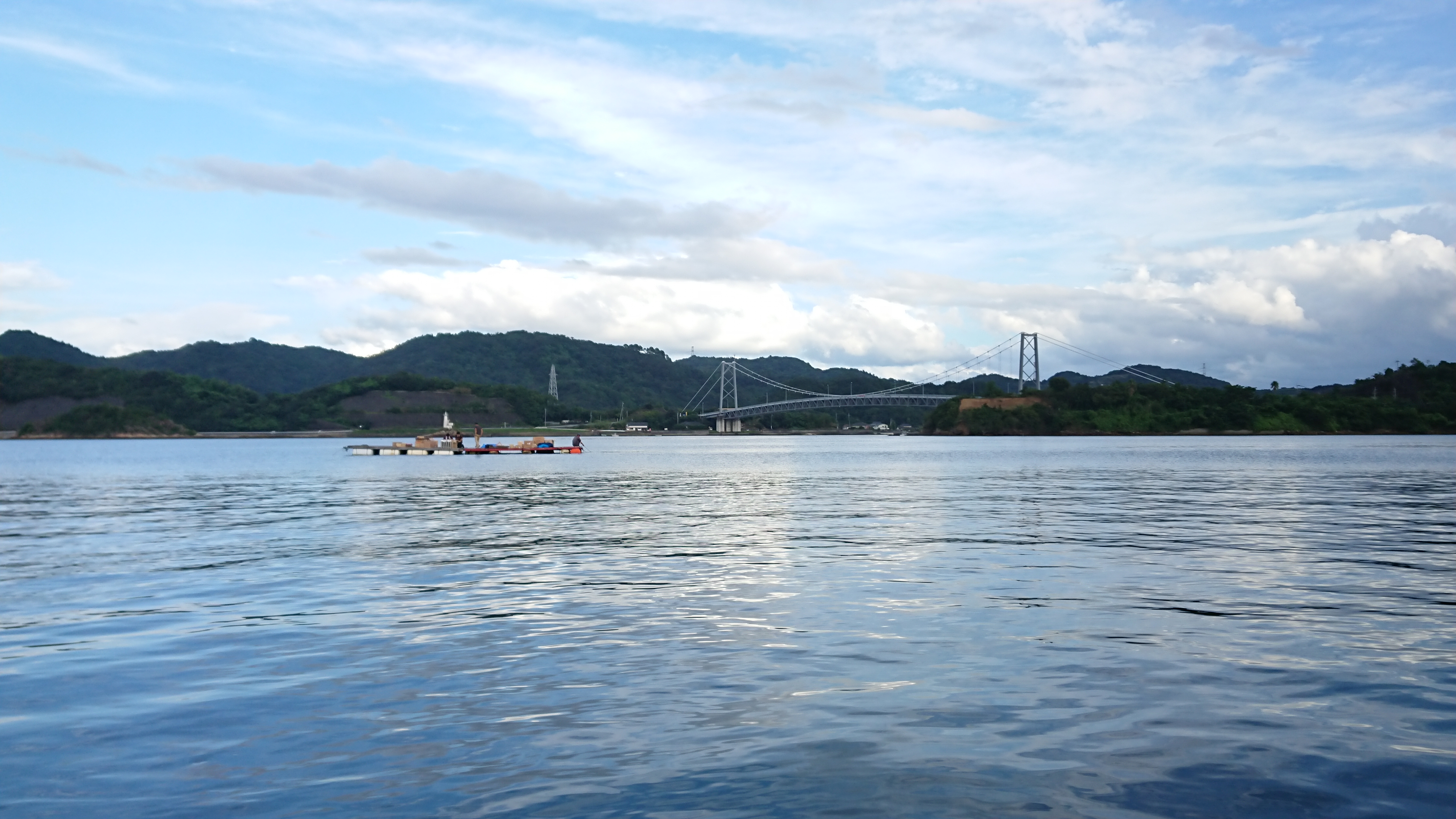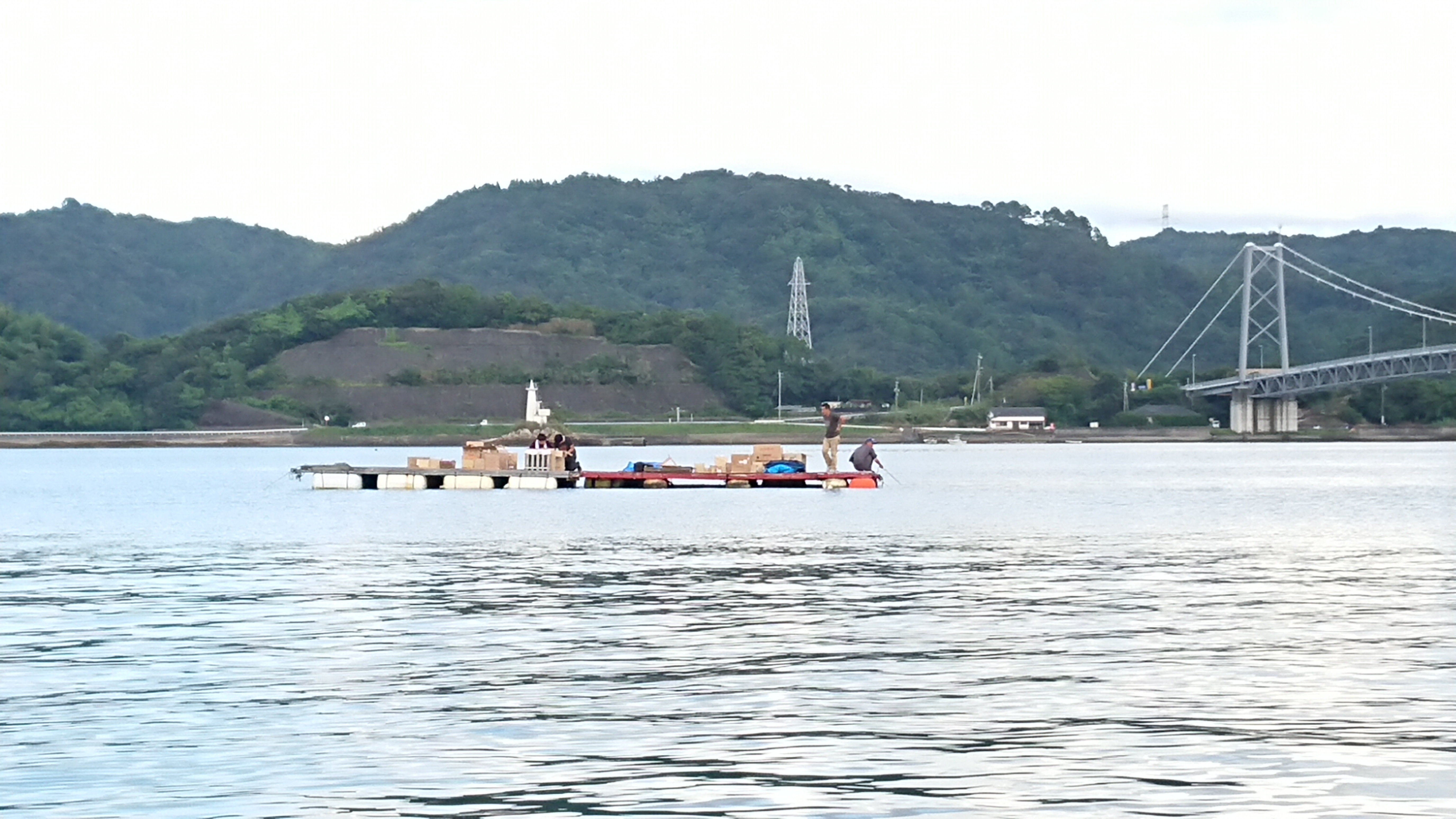 東大維橋の海上に設営される打ち上げ花火の筏。