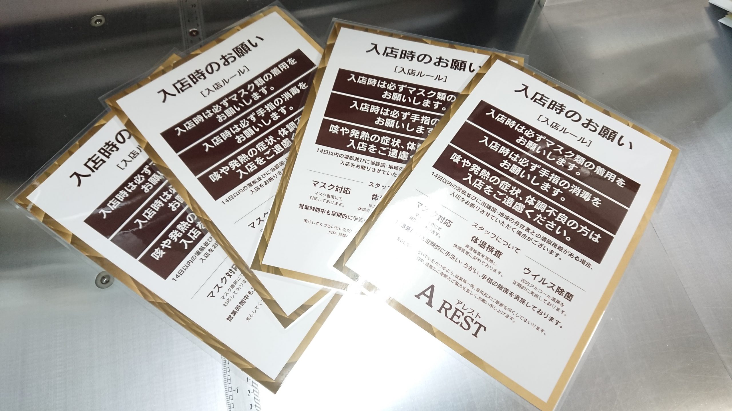 飛沫防止のアクリル板もお作り致しおりますが、コロナの対策の注意事項を印刷してパウチいたします。