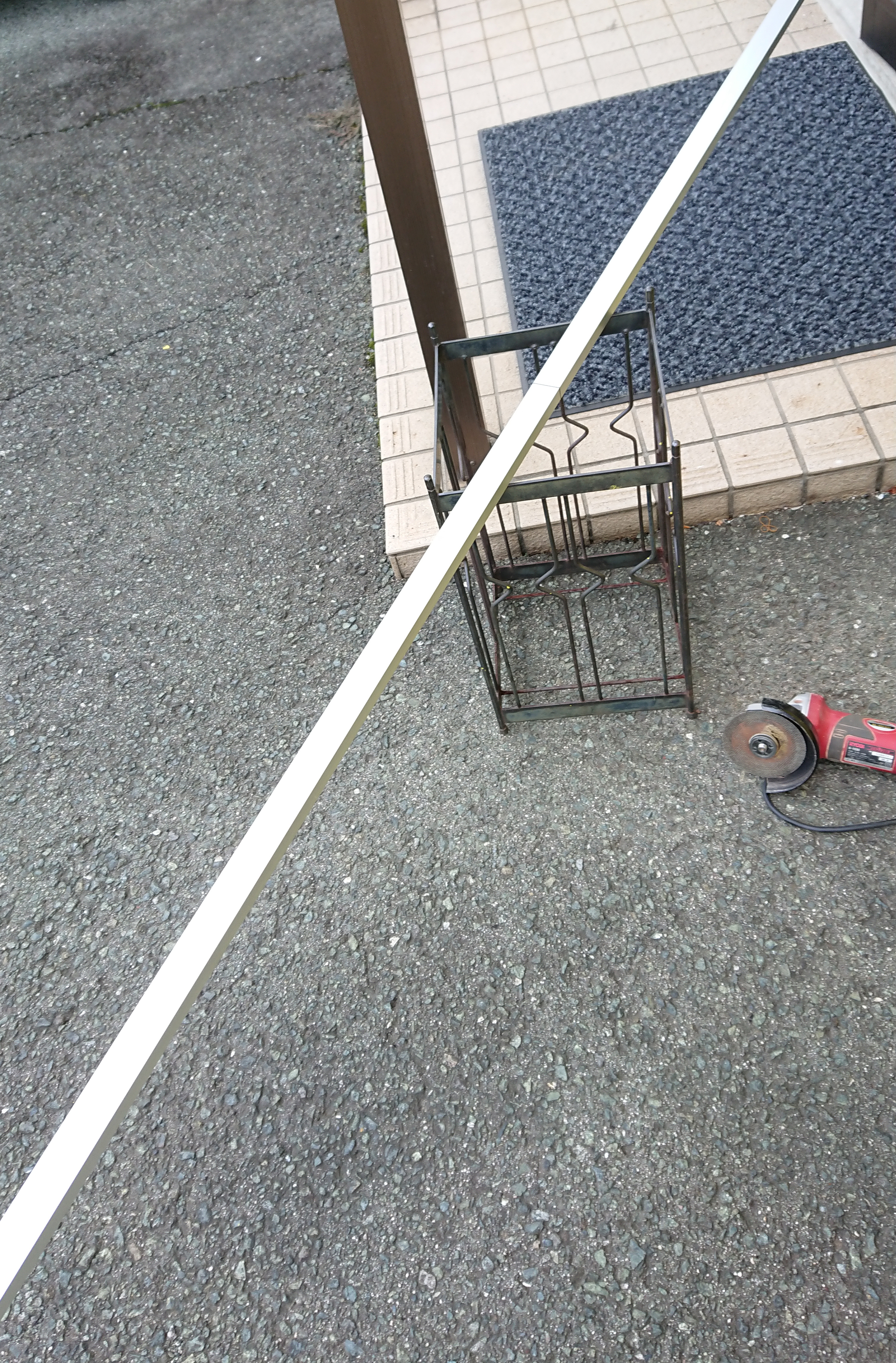 またもや傘立てを台にアルミの角材をカッティング!