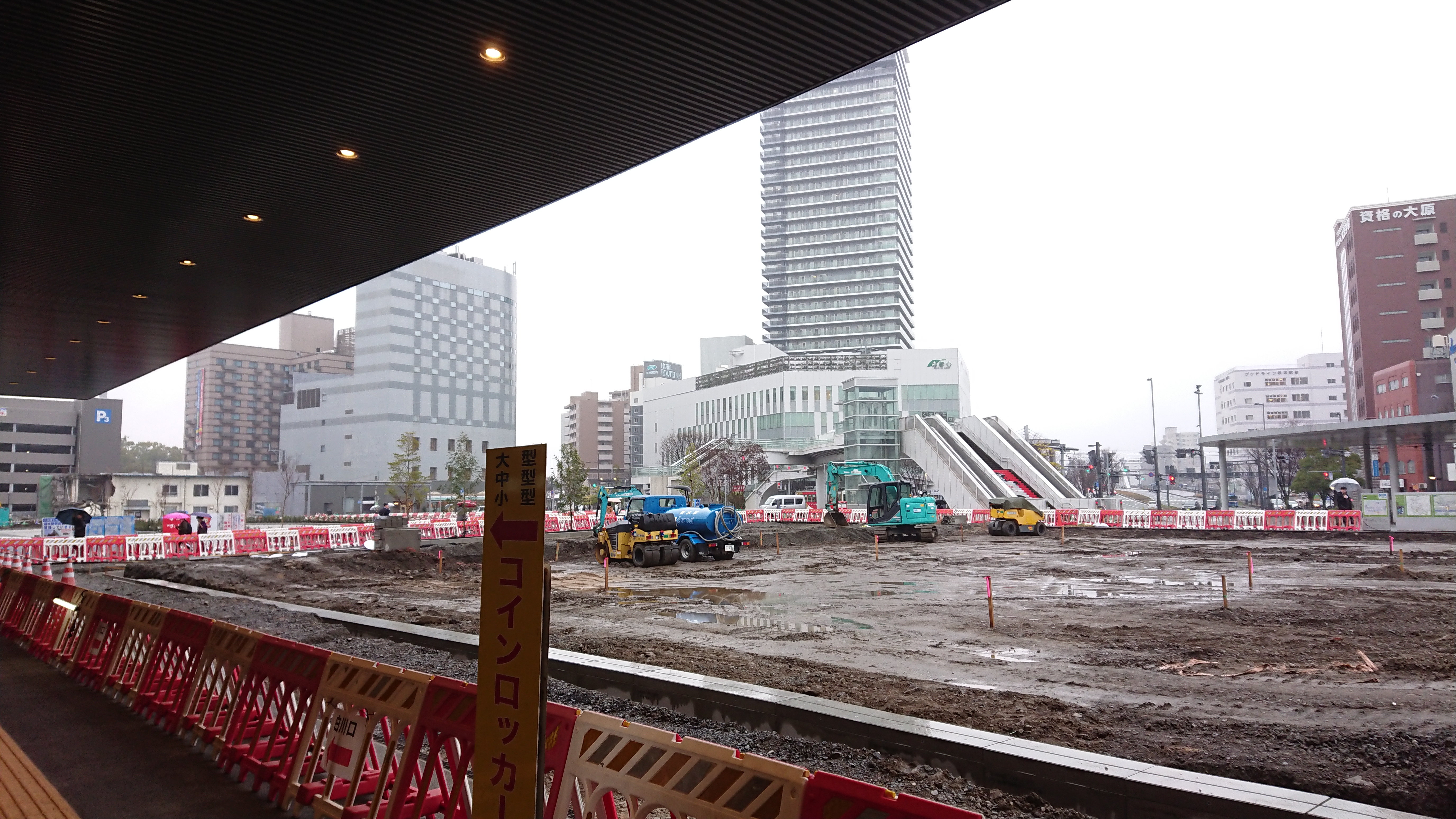 しゃもじ型の雨風をしのげなかった屋根も遠くにあります。市電へのアクセスは…。たしか駅側に寄るのか駅ビルの一階に入るのか。